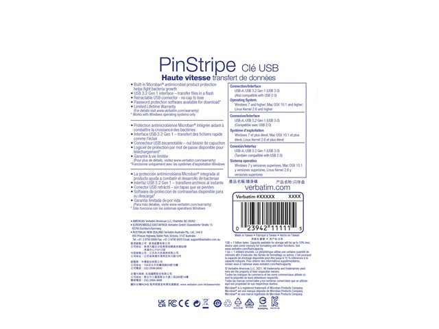 La clé USB Store 'n' Go PinStripe de Verbatim est rétractable, ce qui protège la connexion USB lorsqu'elle n'est pas utilisée, sans nécessiter de capuchon qui se perd facilement.